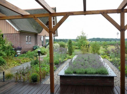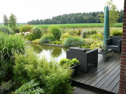 Boerderij tuin in Wekerom rondom een nieuw verbouwde boerderij met ruime waterpartij en “lavendelvijver” bij nieuwe schuur.