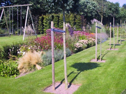 Cottage tuin in Amerongen met langs de vijver; symmetrische Engelse borders tegen ecologische zone.