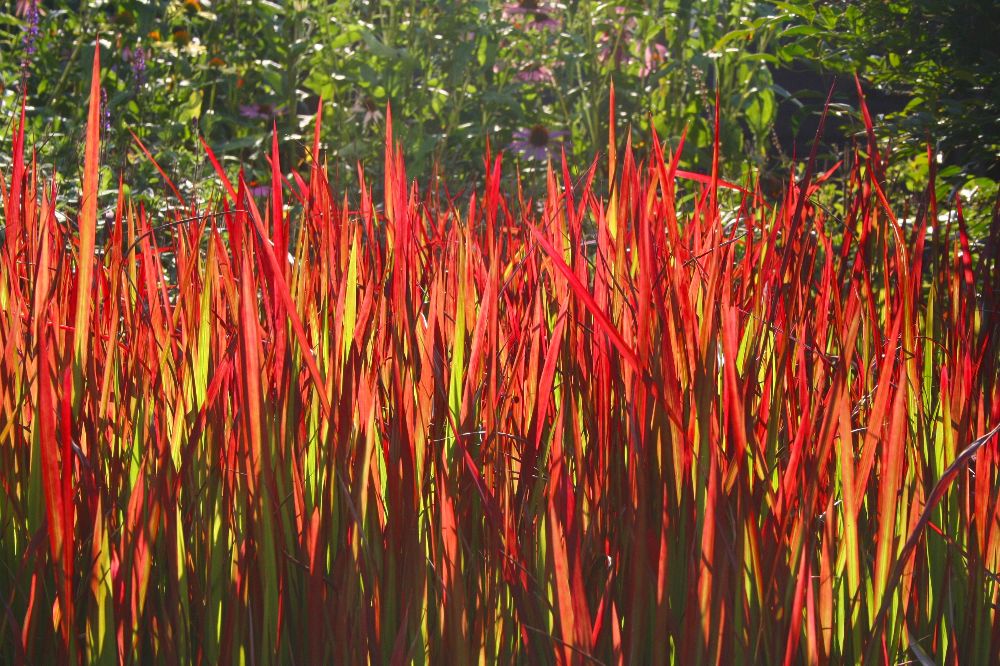 Het bloedrode siergras doet erg zijn best en als de lage zon erdoor schijnt lijkt het wel te gloeien!